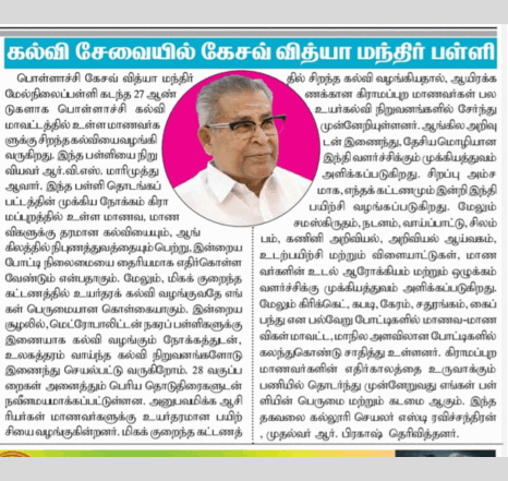 The school was originally started as Swami Chidbhavanada Matriculation School named after Swami Chidbhavananda in 1987. Later in 1997, the school was named as Keshav Vidhya Mandir MHSS to perpetuate the memory of Poojania Keshav Baliram Hedgewar, the founder of Raashtriya Swayam Sevak Sangam.